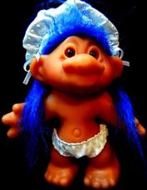 | Dam Troll Doll in blue and white polka dot bonnet and white panties blue hair 6 inches 13.99 |