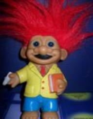 | Teacher troll holding book and chalk molded clothes of yellow jacked and blue pants and red tie with black mustache red hair 6 inches $12.99 |