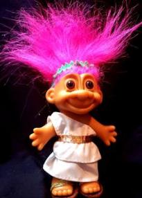 | Russ Troll Doll Greece pink hair toga and sandals with wreath around head 6 inches pink hair 13.25 |