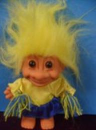 | Russ Cheerleader with blue and yellow cheerleader outfit and pompoms yellow hair 6 inches $12.99 |