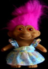 | TNT TROLL dressed in pink gown with white flowers fuchsia hair yellow eyes 6 inches 12.99 |