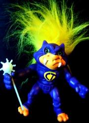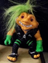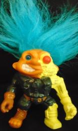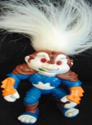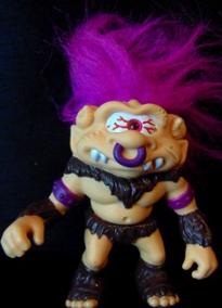| Hasbro Warrior Trolls were introduced in 1992 and were marketed with the slogan “Big Haired Dudes with Bad Attitudes” Each individual troll was provided a brief biographical profile (in parody of a G.I. Joe file card), with details on how to properly "neglect" by housing them in "a dark, smelly place" in an attempt to keep them "cranky, mean and ready to fight anything or anyone for years!". In association with their tough nature, many of them had facial stitches and their toes poking through their boots. |