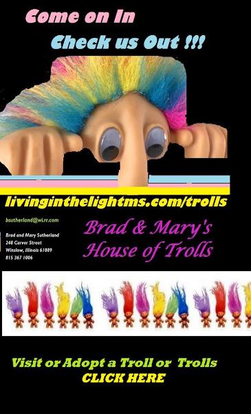 | Welcome to Trolls Trolls Trolls. Troll Dolls for Sale These magical troll dolls bring happiness and magic into your life! Make a wish by rubbing their tummy and stroking their hair! Purchase our trolls through our new shopping cart. Selling our magical troll dolls since 2001 b.sutherland@mediacombb.net If you wish to purchase via check or money order simply contact us via email or telephone to receive your total cost and then send your payment to the following: Mary Sutherland 248 Carver Street Winslow, Illinois 61089 Phone 815 367 1006 |
