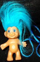 | TROLL DOLL NECKLACE 3 inch troll on string blue hair eyes with blue cord 12.99 |