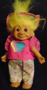 | RUSS TROLL 7 inches yellow hair dressed in pink top printed pants and sun hat ADJUSTABLE ARMS AND LEGS 12.99 |