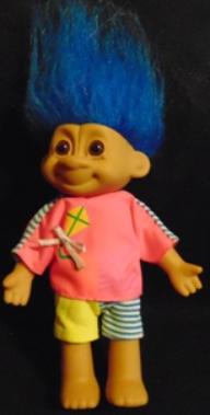 | RUSS TROLL 7 inch boy dressed in yellow and black striped shorts and top blue hair ADJUSTABLE ARMS AND LEGS 12.99 |