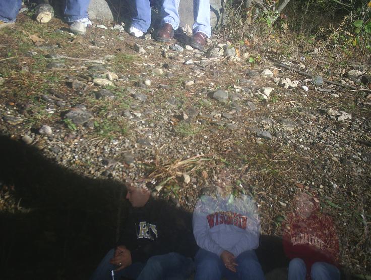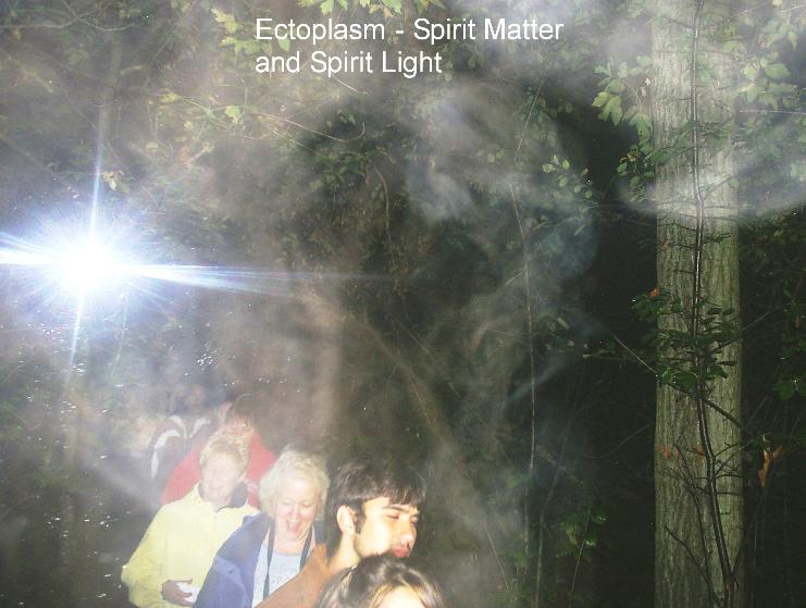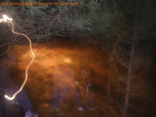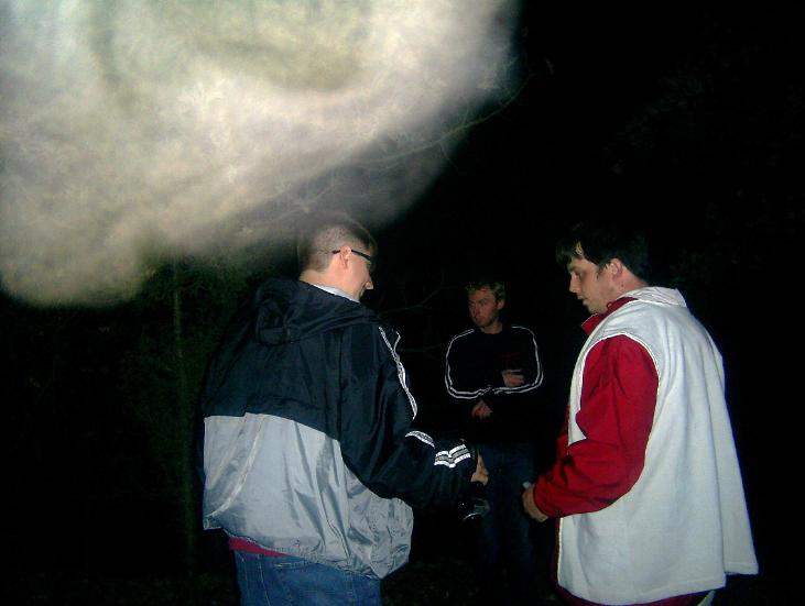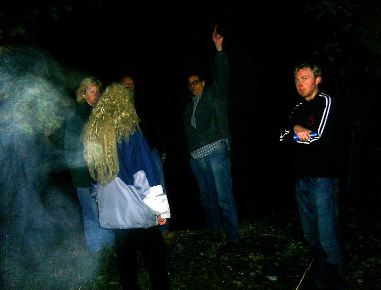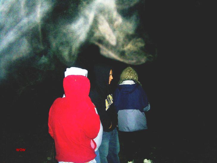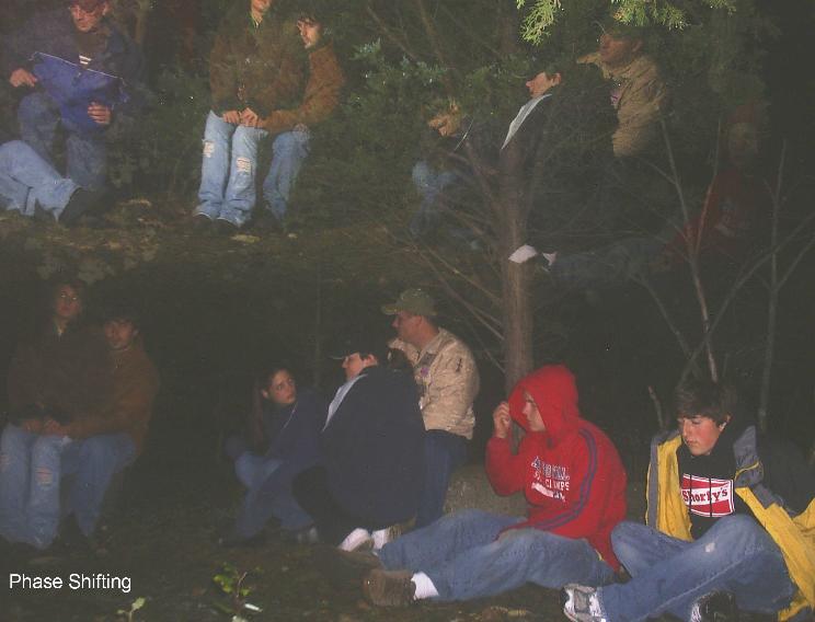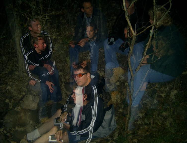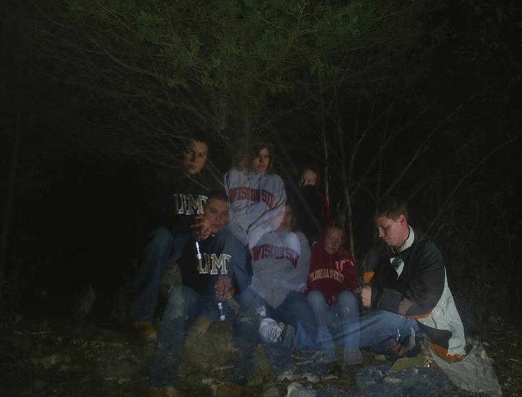 | The guy to the right was working for a paranormal investigation team out of WIsconsin. His job was to "Debunk" the phenomenon that was taking place in the woods. Strangely enough, you see his legs in the photo disappearing and the people around him shifting into the other dimensions. Not surprising, he could not debunk the woods and became a believer of the phenomenon that was taking place there. |